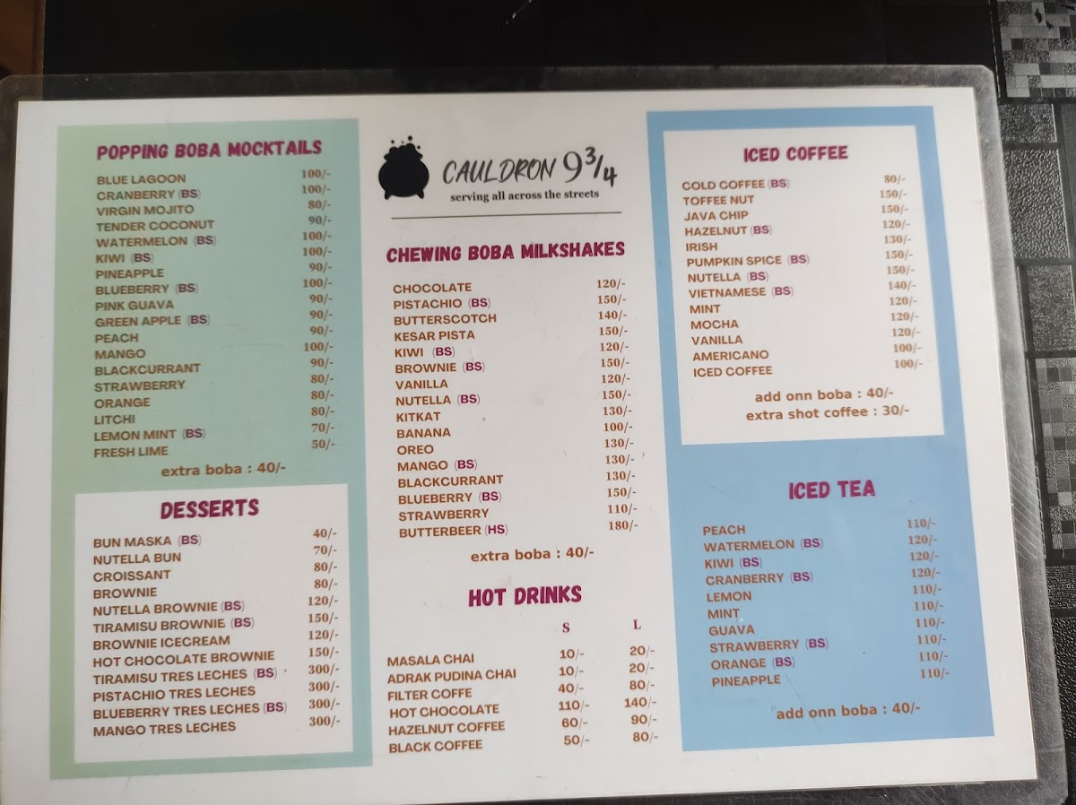 Cauldron 9¾ (Boba Drinks, Coffee, Burgers, Snacks, Dessert) Menu